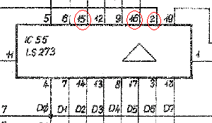 A 74LS273 (IC55) egy 8 bites D tároló a KI-1 portot megvalósító IC. Kinagyítottam a kapcsolási rajzon, hogy mit is kell keresni: