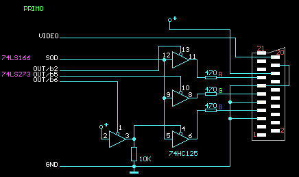 A rajzon látható, hogy a kapcsoláshoz 74HC125-ös mind a 4 meghajtóját felhasználtam. A legelső - melyet az OUT/b6 bit kapcsol - tulajdonképpen egy inverter funkcióját látja el itt. Erre azért van szükség, mert a PRIMO értelmező az általunk használt mindhárom bitet magasra állítja, így bekapcsolás után - ha ez az inverter nem lenne itt - minhárom színt kikapcsolná a gép, fekete alapon fekete betűket "látnánk", azaz semmit sem látnánk. Ezzel a megoldással viszont az alapszín minden esetben a kék lesz. (Megjegyzem, ha neked más alapszín szimpatikus, akkor annak vezérlő bitjét kell invertálni, ennek semmi akadálya.)