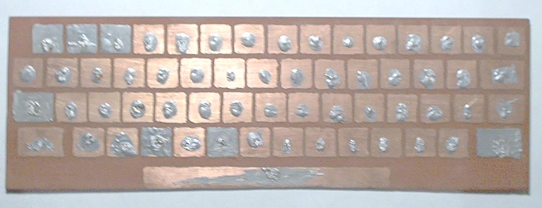 A billentyűzet elektronika egy dupla ESZR (kétoldalon fóliás, galvanizált) próbapanelon készült, huzalozással. A kapcsolása megegyezik a Primo HW füzetben megadott érinto billentyűzet kapcsolással, de tapogatós fólia helyett a Hall generátoros billentyű gombok TTL szintű kimenete van bekötve.