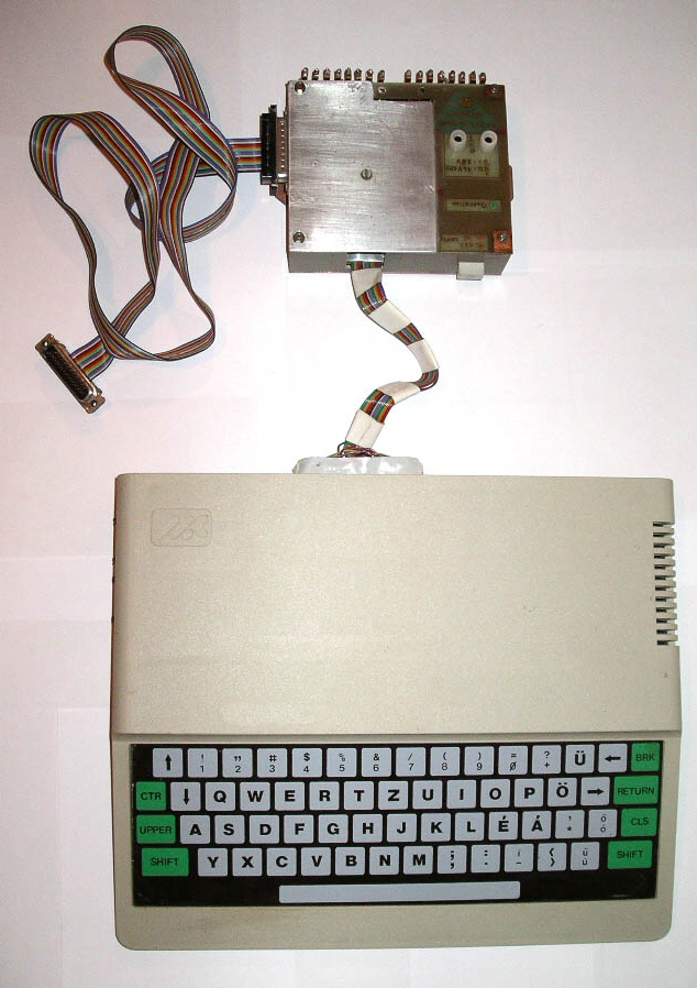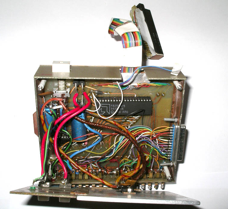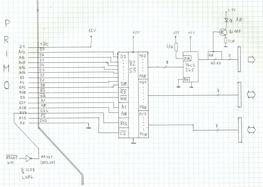 A 8255 A portját egy meghajtó IC-n keresztül vezettem ki, hogy adott esetben nagyobb terhelhetőségű kivezetés is rendelkezésemre álljon. Ennek hátránya, hogy a PIO programozásakor ennek a portnak az irányát mindig kimenetként kell inicializálni. Az A0 bitre egy LED-et is tettem, ami olykor jó szolgálatot tett, ha valami "nem akart stimmelni" a dobozkával. Mikor felmerült bennem a PC-vel való összekötés gondolata, a doboz oldalára egy 25 pólusú Canon aljzatot tettem, és kifejtettem rá a portokat. Így már a Primo-PC kapcsolat 50% -a adott volt.